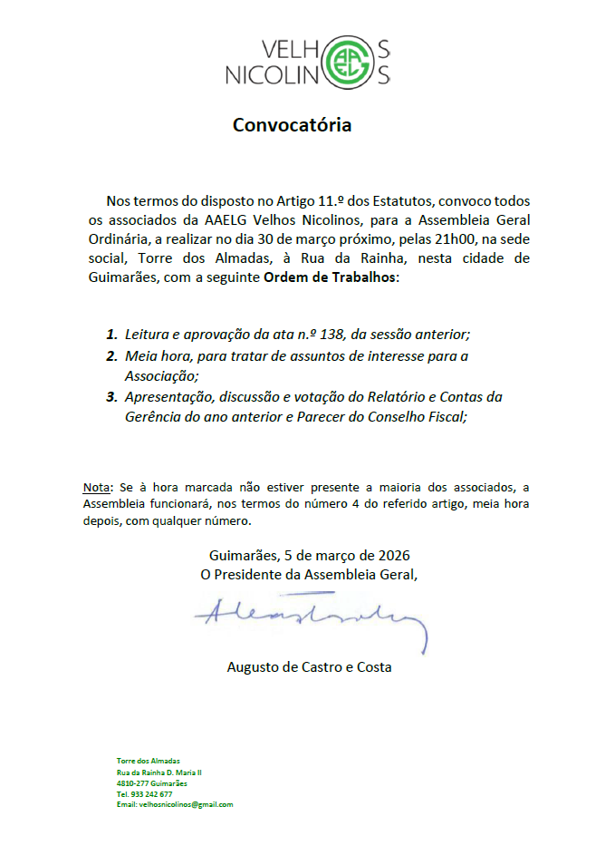 Nos termos do disposto no Artigo 11.º dos Estatutos, convoco todos os associados da AAELG Velhos Nicolinos, para a Assembleia Geral Ordinária, a realizar no dia 30 de março próximo, pelas 21h00, na sede social, Torre dos Almadas, à Rua da Rainha, nesta cidade de Guimarães, com a seguinte Ordem de Trabalhos: